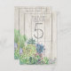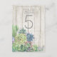 Fuentes únicas, suculentas coloridas en acuarela y fondos de tablones de madera rústica son los aspectos más destacados de estos productos de boda para combinar. Esta hermosa tarjeta de número de mesa tiene bordes de follaje en una esquina sobre un fondo blanco con una plantilla proporcionada para editar números. El producto está reflejado en el reverso. Busque ID515 para ver todos los productos coincidentes en este conjunto.