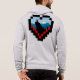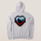A minimalist illustration of a lone figure sitting on a mountain peak at sunrise, framed inside a pixelated heart, combining a love for nature