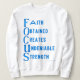 Esta sudadera femenina muestra la palabra "Focus" en un tipo de letra de alta impresión de crucero que compone el acrónimo con la frase (Faith, Obtención, Crea, Innegable, Strength) letras azules en este estilo y tema de AMMO Apparel USA. Este suéter está hecho de algodón 100% esta camisa es a la vez lujosa y duradera, lo que hace una gran combinación.