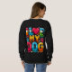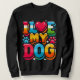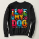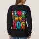 El diseño de la camiseta muestra la frase "Amo a mi perro" en tipografía atrevida y juguetona. La palabra "amor" está representada por un gran corazón rojo, que añade un vibrante pop de color. Alrededor del texto hay adorables huellas de pata y pequeños ilustraciones relacionados con perros como huesos y un collar para perros. El diseño es sencillo, cálido y perfecto para expresar el afecto del dueño de un perro en un estilo divertido e informal.