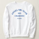Club de esquí Après, escudo de la estación de esquí azul invernal, suéter blanco. Personalice su estancia con el año de su viaje de esquí, el nombre de la estación y su ubicación. Perfecto para una excursión de esquí de destino grupal, como regalo para recordar un viaje pasado o para una fiesta de tocador tema de esquí después de un rato. Diseñado para coincidir con nuestra Colección Après Ski Club.