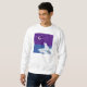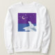 Un cachorro ártico blanco del oso polar con los ojos azules brillantes que se sientan en la nieve que mira para arriba en la luna y las estrellas crecientes en el cielo de color morado oscuro de la noche sobre las aguas heladas azules. Arte animal original de Alicia Marie.