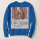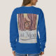 Un curioso gato tabby, naranja, asoma desde detrás de una cortina rosa a esta sudadera azul. Las palabras de Cat Mom están debajo de la imagen con texto plateado y una línea curvada de plata. La imagen está en la parte delantera y trasera de la sudadera. La sudadera es una sudadera azul de manga larga para mujeres.