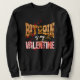 BITCOIN Maximalista divertido ES MI sudadera VALENTINE, mostrando un BITCOIN arqueado en tipo universitario, y una foto de la moneda de Bitcoin dentro de la palabra. La palabra VALENTINE tiene diferentes patrones de corazón dentro de cada letra de la palabra. Diseñado en un estilo maximalista, con grupos de corazones y Bitcoin en cascada en el fondo.