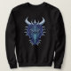Sudadera de dragón azul Guay con un ilustracion digital de la cabeza de esta criatura mágica fría con cuernos en colores morados y azules sobre fondo azul oscuro.