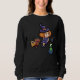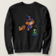 Arte de píxel adorable de una bruja de cabello rojo en un palo de escoba con un gato negro, calabaza, murciélago y caldero burbujeante, perfecto para el equipo de Halloween
