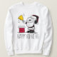 Celebre las vacaciones y su amor por los cacahuetes con este diseño de suéter de Navidades feos que presenta a Snoopy y Woodstock con Snoopy como Santa sonando una campana.