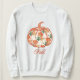 ¡Sudadera en un diseño! con un contorno de calabaza lleno de un rico patrón de crisantemo floral en cálidos tonos naranja y verde, captura la esencia del otoño.