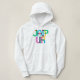 Lo usamos en voz alta Jaipur. Colores primarios luminosos con superposiciones translúcidas. Grandes letras en bloque.