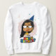 La obra de arte cuenta con un chica elegante con el pelo oscuro largo, lentes y pendientes dorados, vestido con un traje amarillo brillante y sosteniendo un ☕ de café. Está lista para el fiesta con un 🎂 de gorra azul de cumpleaños, ambientada en un fondo geométrico festivo lleno de detalles coloridos.