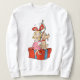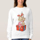 This absolutely darling illustration captures a moment of pure holiday joy! Cindy Lou Who, dressed sweetly in pink with her big red bow, is sitting happily atop a large, colorful Christmas present (red with a blue ribbon). Beside her sits her loyal friend, Max the Dog, looking cheerful and sporting his single reindeer antler! This heartwarming graphic perfectly celebrates friendship and the sweet excitement of Christmas morning.