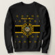 Ropa negra con diseño de círculos concéntricos dorados, negros y blancos, encima de un rectángulo negro y dorado con "COLUMBIA, MISSOURI CENTER OF THE UNIIVERSE" con el Gran Sello de Misuri en el centro y con logotipos Y-NOT-ME en el fondo. Este diseño es un grito a Columbia, Missouri, una ciudad en movimiento.