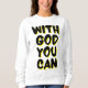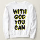El diseño de esta mujer tiene las palabras "Con Dios que puedas" en un estilo de burbuja impreso más letras negras y contorno de sombra amarilla con un estilo de tipografía en este tema basado en la fe. Esta sudadera está hecha de 100% algodón esta camisa es a la vez lujosa y duradera, lo que hace una gran combinación con una imagen menor que se empareja impresa en la parte posterior.