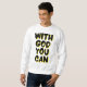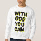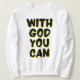 Este diseño de sudaderas tiene las palabras "Con Dios que puedas" en una impresión de estilo burbuja más letras negras y contorno de sombras amarillas con un estilo tipográfico en este tema basado en la fe. Esta sudadera está hecha de 100% algodón esta camisa es a la vez lujosa y duradera, lo que hace una gran combinación con una imagen menor que se corresponde en la parte posterior.