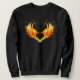 Ángel dispara el corazón con las alas flameantes sobre fondo negro.