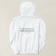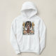 Esta imagen muestra a una persona usando una capucha blanca con un diseño destacado en la parte delantera. El diseño gráfico incluye un ilustracion detallado de una mujer con el pelo rizado oscuro, usando una banda de leopardo impreso en la cabeza. Sus manos están unidas en una pose de oración, y ella tiene una expresión serena y tranquila. Detrás de ella hay una cruz dorada que simboliza la fe, rodeada de elementos florales como rosas y vegetación. Debajo de la imagen, la palabra BELIEVE está impresa en negrita, y sirve como mensaje central del diseño. El capucha tiene un ajuste casual con un bolsillo delantero y cuerdas levadizas.