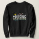 El diseño de cruceros utiliza la palabra "cruceros" para crear un crucero que navega a destinos extranjeros exóticos a través de los mares azules. Incluye sol, ancla, embudos de vapor y ojos de cabaña para crear un gráfico divertido para los aficionados a las vacaciones de crucero.