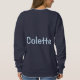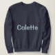 This is a Navy Blue Women's Basic Sweatshirt. The navy blue sweatshirt is customized with a woman's name, Colette. The name is a Chambray Comfort Color light blue color. The name Colette is on the front and back of the sweatshirt. You can replace the name by clicking the Personalize link. The sweatshirt fits true to size. The sweatshirt is a cotton polyester blend. The sweatshirt has set-in sleeves and double-needle stitched neckline, armholes and bottom band for long-term durability. The fabric is imported. The fabric care instructions are machine wash cold and tumble dry low.