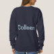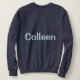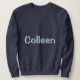 This is a Navy Blue Women's Basic Sweatshirt. The navy blue sweatshirt is customized with a woman's name, Colleen. The name is a Chambray Comfort Color light blue color. The name Colleen is on the front and back of the sweatshirt. You can replace the name by clicking the Personalize link. The sweatshirt fits true to size. The sweatshirt is a cotton polyester blend. The sweatshirt has set-in sleeves and double-needle stitched neckline, armholes and bottom band for long-term durability. The fabric is imported. The fabric care instructions are machine wash cold and tumble dry low.