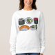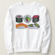 La sudadera presenta un original ilustracion de marca de una fila de sushi delicioso que incluye rollo de atún picante, rollo de California, rollo de caviar, nigiri de salmón y rollo de aguacate. ¡Genial para cualquier apasionado de la comida japonesa!