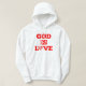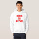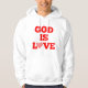 Esta hoodie presenta un fragmento de cinco letras impresas con letras rojas mostrando el dicho bíblico "Dios es amor" con el O en amor hecho reemplazado por una colección de la palabra amor hecha en un corazón en este tema bíblico de la cita del dicho. Este capuchón está hecho de una mezcla de algodón de 10 oz y mangas de ajuste de la cara de algodón al 100% y de agujeros con puntas de aguja dobles y banda inferior para mayor durabilidad, tiene una imagen de coincidencia en la parte posterior.