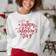 Difundan buena alegría en esta temporada de San Valentín con este lindo y elegante suéter que dice 'Feliz Día de San Valentín' en un divertido guión rojo decorativo con detalles del corazón.