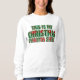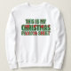 Esta sudadera blanca muestra texto en negrita en un estampado festivo rojo y verde. La frase "ESTA ES MI" aparece en la parte superior, seguida por "NAVIDADES" en una letra más grande, y "CAMISETA DE PAJAMA" en la parte inferior. El diseño es sencillo y se define directamente como una cómoda prenda de Navidad.
