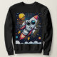 Un cohete de estilo retro explota en un cosmos colorido y estrellado. Está diseñado con mucho gusto, con ojos grandes y una cara amigable, añadiendo un toque de capricho a la escena. El intenso sendero de escape del cohete y los planetas vibrantes en el fondo crean una sensación de movimiento dinámico y aventura.