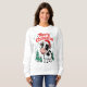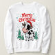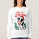 Esta imagen muestra una sudadera blanca con una vaca personalizado en blanco y negro usando un sombrero de Santa. El texto "Feliz Navidad" está escrito con letras rojas y verdes festivas sobre la vaca, rodeado de copos de nieve y torbellinos. La vaca se encuentra entre estilizados árboles de Navidad verdes, creando un alegre tema de vacaciones.