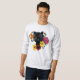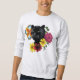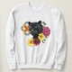 Poderoso retrato de estilo tatuaje de jaguar negro. El jaguar está rodeado de flores mexicanas coloridas y vibrantes en rojos, fucsia y amarillos. Detrás del Jaguar hay una tradicional baldosa mexicana en un fondo verde azulado.