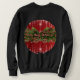 🎄☕This funny "Coffee Makes Me Merry!!" quote on this warm, black sweatshirt rests on a festive coffee bean and pinecone garland on a sparkly red background with glistening silver icicles.