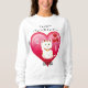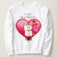 Un gato afortunado y humorístico (Maneki Neko) con corazón y globos para El día de San Valentín. Traducción japonesa: "Feliz Día de San Valentín" al principio, "Maneki Neko" al final, "Amor" a la izquierda, y "Suerte" a la derecha en el corazón.