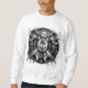 La imagen es un ilustracion detallado y místico centrado alrededor de la cara de un gato con ojos azules llamativos. La cara del gato está rodeada de elementos intrincados y simbólicos, dándole un aura de poder y sabiduría. Encima de la cabeza del gato hay un sol radiante con una cara humana que añade una cualidad celeste y divina a la escena. A ambos lados del gato hay dos palomas huyendo, que representan paz y pureza. Toda la composición está enmarcada por elementos circulares, mecánicos y celestes, como engranajes, cadenas y estrellas, que evocan una sensación de equilibrio y misterio cósmico. Dos espadas ornamentadas cruzan bajo la cara del gato, simbolizando protección y fuerza. Estas espadas están adornadas con elementos decorativos y se complementan con alas, lo que realza aún más la temática mística de la imagen. El estilo general de la imagen es monocromático, con detalles finos y una mezcla de patrones orgánicos y geométricos que crean un sentido de armonía y poder. La combinación de estos elementos sugiere temas como la tutela, la perspicacia espiritual y el orden cósmico, en los que el gato es una figura central, casi divina, en este intrincado tableau de otro mundo.