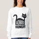 Gato negro estilizado con rasgos exagerados, incluyendo ojos grandes y orejas puntiagudas. El cuerpo del gato tiene una forma abstracta, curvada, y se coloca de una manera que sugiere que es juguetón o curioso. Debajo del gato, las palabras "SIEMPRE HAMBRE" aparecen de forma prominente en letras blancas en negrita. El diseño general es sencillo pero sorprendente, combinando una representación caprichosa de un gato con un mensaje humorístico sobre su apetito. El fondo es blanco y liso, destacando la silueta negra del gato y el texto.