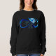 Luminous infinity symbol with glowing, beautiful, lushly blooming rose made of blue flames on black background.