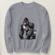 Una audaz ilustración en blanco y negro de un poderoso gorila que lleva gafas de sol rojas en forma de corazón y una sonrisa sarcástica. Este diseño llamativo combina fuerza, humor y amor en un gráfico impactante de estilo arte callejero.