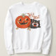 Esta sudadera adorable y de moda de Halloween muestra un ilustracion vintage de un gato negro gritando en una calabaza sonriente de un farol con las palabras "Truco o truco".