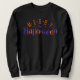 Esta sudadera elegante y de moda de Halloween muestra las palabras "Merry Halloween" en colores festivos morados y naranjas.