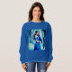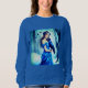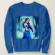 Camisas sudaderas en el ilustracion de una joven con un vestido azul paradas en un bosque nevado, sosteniendo un cuervo. La escena es serena, con dos cuervos más volando en el fondo contra un telón de fondo de árboles desnudos y un cielo iluminado por el crepúsculo.