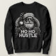 Ilustracion monocromo de Santa Claus como estrella de rock rebelde, vestido con una chaqueta de cuero tachonado y gafas de sol, con la frase en negrita ‘HO HUSTLE' destacada en letras de alto contraste