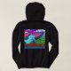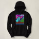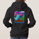 Sudadera con capucha divertida para mujeres adultas con ilustración de dinosaurio pixelado; Este divertido diseño nostálgico presenta arte pixelado de un dinosaurio en la naturaleza. Hay montañas, abetos y nubes en un cielo colorido. En la parte delantera de la sudadera con capucha hay una fuente pixelada que dice "START" y en la parte trasera una fuente pixelada que dice "GAME OVER". He utilizado una paleta de colores llamativos para darle al arte un estilo de videojuegos de los 90.