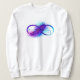 Símbolo infinito con una hermosa pluma pintada de color violeta y azul brillante sobre fondo blanco.
