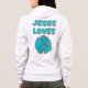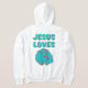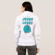 Esta capucha de mujer tiene una mano azul con un dedo señalador más un contorno de sombra roja que muestra las palabras "Jesús ama" en un letra negrita con un contorno de sombra coincidente en el tema de la cita basada en la fe. Esta capucha es increíblemente suave y relajada, hilada a partir de una mezcla lujosa de polialgodón, ideal para el uso diario con una imagen más grande que se combina en la parte posterior.