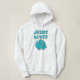 Esta capucha de mujer tiene una mano azul con un dedo señalador más un contorno de sombra roja que muestra las palabras "Jesús ama" en un letra negrita con un contorno de sombra coincidente en el tema de la cita basada en la fe. Este capuchón está hecho de una mezcla de algodón de 10 oz con mangas de 100% de algodón y agujeros con armaduras de doble aguja y banda inferior para mayor durabilidad, con una imagen más pequeña que se encuentra impresa en la parte posterior.
