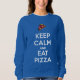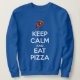 Keep Calm and Eat Pizza design featuring a cartoon pizza slice and bright red typography. Perfect for pizza lovers and foodies who love funny pizza quotes. Great for tees, posters or gifts.