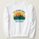 Beautiful family lake vacation sweatshirts featuring the pretty blue waters under the forest of trees and cool orange sunset. Cute camping trip keepsake for your nature outing or wilderness group.