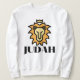 Este sudadero tiene un diseño que presenta la palabra "Judah" en un audaz y único tipo de letra con letras negras que muestran una imagen de estilo personalizado de la cabeza de un león con la corona del rey en el centro en este tema de citas basadas en la fe. Esta sudadera está hecha de 100% algodón esta camisa es a la vez lujosa y duradera, lo que hace una gran combinación con una imagen menor que se corresponde en la parte posterior.