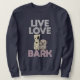 Dos perros lindos - un toro terrier y un pug con el dicho "Viva, Amor, Bark".