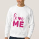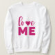 This design features the phrase “love ME” in a bold and expressive style. The word “love” is written in lowercase, while “ME” appears in bold uppercase letters, creating a strong visual contrast. The letter “o” in “love” is replaced by a pink heart filled with tiny heart shapes, adding a sweet and affectionate touch. The entire text is pink against a black background, giving the design a modern and striking appearance.