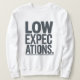Low Expectations delivers quiet sarcasm through simple typography and generous spacing. A clean, wearable design for fans of dry humor.